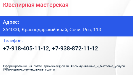 Ювелирная мастерская по адресу 354000, Краснодарский край, Сочи, Роз, 113 в дальнейшем Организация, размещена в следующих категориях: