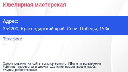 Ювелирная мастерская по адресу 354200, Краснодарский край, Сочи, Победы, 153к в дальнейшем Организация, размещена в следующих категориях: