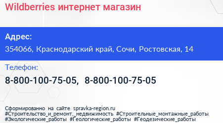 Wildberries, интернет-магазин по адресу 354066, Краснодарский край, Сочи, Ростовская, 14 в дальнейшем Организация, размещена в следующих категориях: