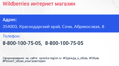 Wildberries, интернет-магазин по адресу 354003, Краснодарский край, Сочи, Абрикосовая, 8 в дальнейшем Организация, размещена в следующих категориях: