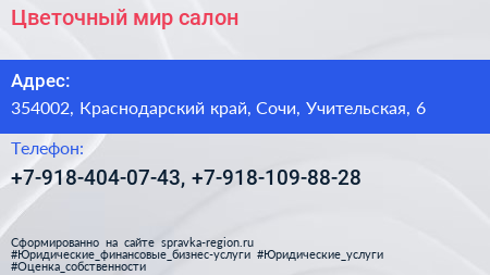 Цветочный мир, салон по адресу 354002, Краснодарский край, Сочи, Учительская, 6 в дальнейшем Организация, размещена в следующих категориях: