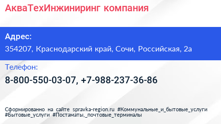 АкваТехИнжиниринг, компания по адресу 354207, Краснодарский край, Сочи, Российская, 2а в дальнейшем Организация, размещена в следующих категориях: