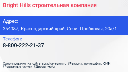 Bright Hills, строительная компания по адресу 354387, Краснодарский край, Сочи, Пробковая, 20а/1 в дальнейшем Организация, размещена в следующих категориях: