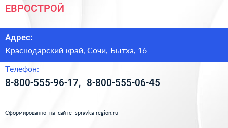 ЕВРОСТРОЙ по адресу Краснодарский край, Сочи, Бытха, 16 в дальнейшем Организация, размещена в следующих категориях: