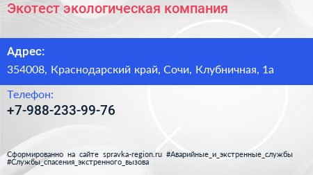 Экотест, экологическая компания по адресу 354008, Краснодарский край, Сочи, Клубничная, 1а в дальнейшем Организация, размещена в следующих категориях: