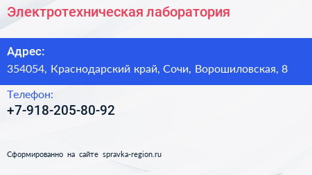 Электротехническая лаборатория по адресу 354054, Краснодарский край, Сочи, Ворошиловская, 8 в дальнейшем Организация, размещена в следующих категориях: