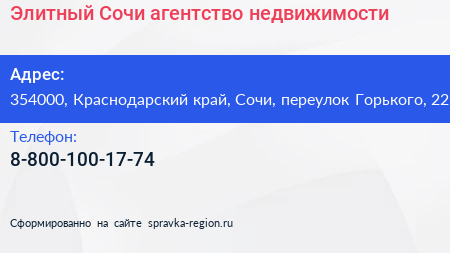 Элитный Сочи, агентство недвижимости по адресу 354000, Краснодарский край, Сочи, переулок Горького, 22 в дальнейшем Организация, размещена в следующих категориях: