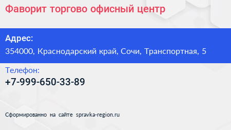 Фаворит, торгово-офисный центр по адресу 354000, Краснодарский край, Сочи, Транспортная, 5 в дальнейшем Организация, размещена в следующих категориях: