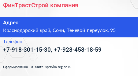 ФинТрастСтрой, компания по адресу Краснодарский край, Сочи, Теневой переулок, 95 в дальнейшем Организация, размещена в следующих категориях: