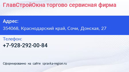 ГлавСтройОкна, торгово-сервисная фирма по адресу 354068, Краснодарский край, Сочи, Донская, 27 в дальнейшем Организация, размещена в следующих категориях: