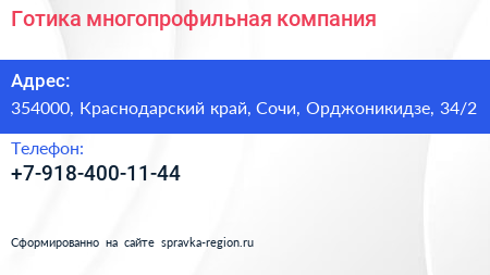 Готика, многопрофильная компания по адресу 354000, Краснодарский край, Сочи, Орджоникидзе, 34/2 в дальнейшем Организация, размещена в следующих категориях: