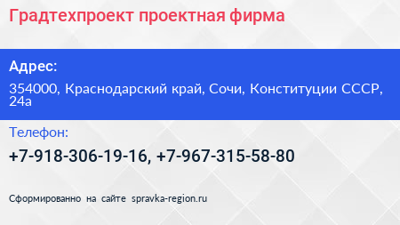 Градтехпроект, проектная фирма по адресу 354000, Краснодарский край, Сочи, Конституции СССР, 24а в дальнейшем Организация, размещена в следующих категориях:
