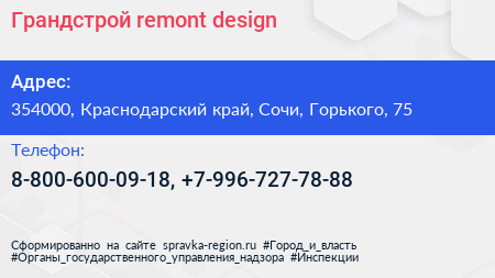 Грандстрой remont & design по адресу 354000, Краснодарский край, Сочи, Горького, 75 в дальнейшем Организация, размещена в следующих категориях: