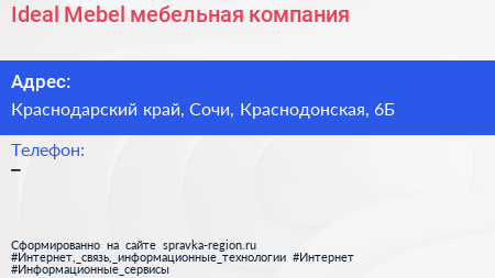 Ideal Mebel, мебельная компания по адресу Краснодарский край, Сочи, Краснодонская, 6Б в дальнейшем Организация, размещена в следующих категориях: