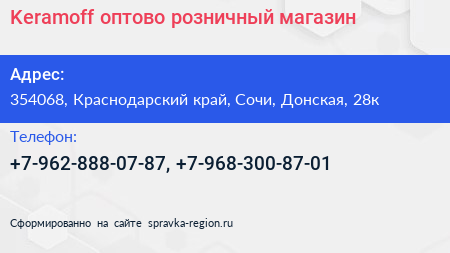 Keramoff, оптово-розничный магазин по адресу 354068, Краснодарский край, Сочи, Донская, 28к в дальнейшем Организация, размещена в следующих категориях:
