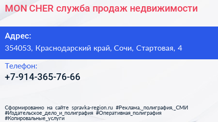 MON CHER, служба продаж недвижимости по адресу 354053, Краснодарский край, Сочи, Стартовая, 4 в дальнейшем Организация, размещена в следующих категориях: