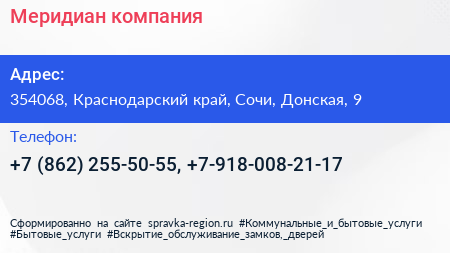 Меридиан, компания по адресу 354068, Краснодарский край, Сочи, Донская, 9 в дальнейшем Организация, размещена в следующих категориях: