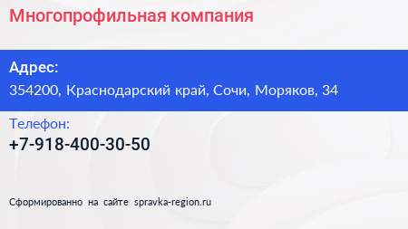 Многопрофильная компания по адресу 354200, Краснодарский край, Сочи, Моряков, 34 в дальнейшем Организация, размещена в следующих категориях: