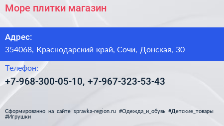 Море плитки, магазин по адресу 354068, Краснодарский край, Сочи, Донская, 30 в дальнейшем Организация, размещена в следующих категориях: