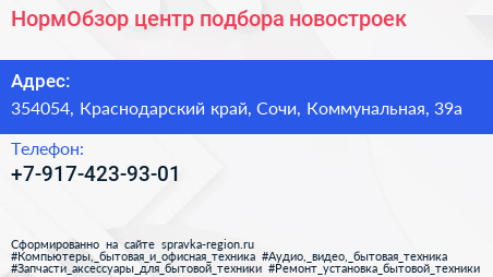 НормОбзор, центр подбора новостроек по адресу 354054, Краснодарский край, Сочи, Коммунальная, 39а в дальнейшем Организация, размещена в следующих категориях: