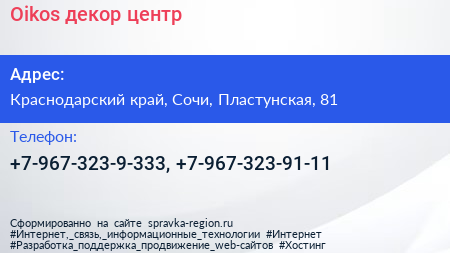 Oikos, декор-центр по адресу Краснодарский край, Сочи, Пластунская, 81 в дальнейшем Организация, размещена в следующих категориях: