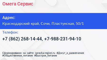 Омега-Сервис по адресу Краснодарский край, Сочи, Пластунская, 50/1 в дальнейшем Организация, размещена в следующих категориях: