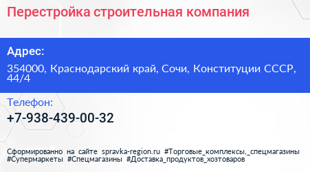 Перестройка, строительная компания по адресу 354000, Краснодарский край, Сочи, Конституции СССР, 44/4 в дальнейшем Организация, размещена в следующих категориях: