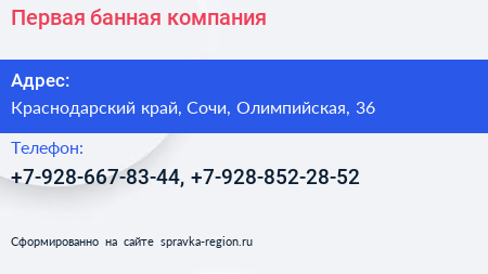 Первая банная компания по адресу Краснодарский край, Сочи, Олимпийская, 36 в дальнейшем Организация, размещена в следующих категориях: