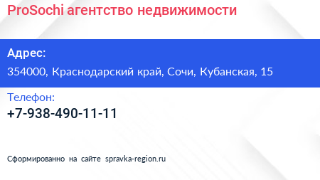 ProSochi, агентство недвижимости по адресу 354000, Краснодарский край, Сочи, Кубанская, 15 в дальнейшем Организация, размещена в следующих категориях: