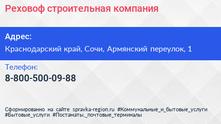 Реховоф, строительная компания по адресу Краснодарский край, Сочи, Армянский переулок, 1 в дальнейшем Организация, размещена в следующих категориях: