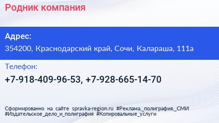 Родник, компания по адресу 354200, Краснодарский край, Сочи, Калараша, 111а в дальнейшем Организация, размещена в следующих категориях: