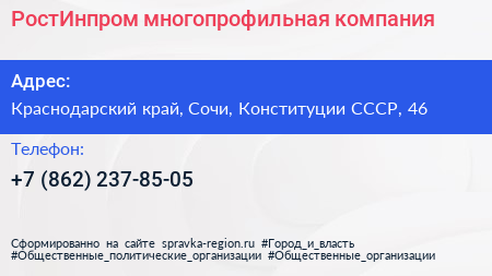 РостИнпром, многопрофильная компания по адресу Краснодарский край, Сочи, Конституции СССР, 46 в дальнейшем Организация, размещена в следующих категориях: