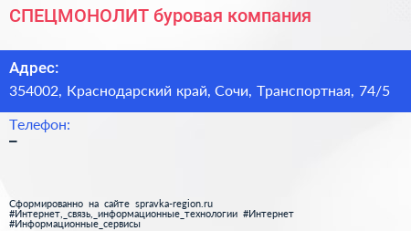 СПЕЦМОНОЛИТ, буровая компания по адресу 354002, Краснодарский край, Сочи, Транспортная, 74/5 в дальнейшем Организация, размещена в следующих категориях: