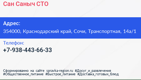 Сан Саныч, СТО по адресу 354000, Краснодарский край, Сочи, Транспортная, 14а/1 в дальнейшем Организация, размещена в следующих категориях: