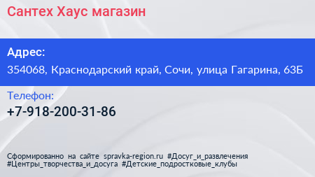Сантех Хаус, магазин по адресу 354068, Краснодарский край, Сочи, улица Гагарина, 63Б в дальнейшем Организация, размещена в следующих категориях: