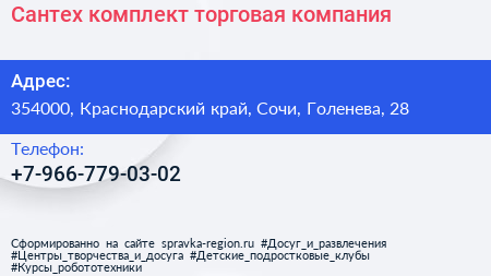 Сантех комплект, торговая компания по адресу 354000, Краснодарский край, Сочи, Голенева, 28 в дальнейшем Организация, размещена в следующих категориях: