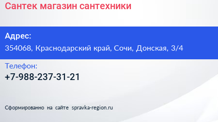 Сантек, магазин сантехники по адресу 354068, Краснодарский край, Сочи, Донская, 3/4 в дальнейшем Организация, размещена в следующих категориях: