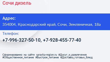 Сочи дизель по адресу 354004, Краснодарский край, Сочи, Земляничная, 18а в дальнейшем Организация, размещена в следующих категориях:
