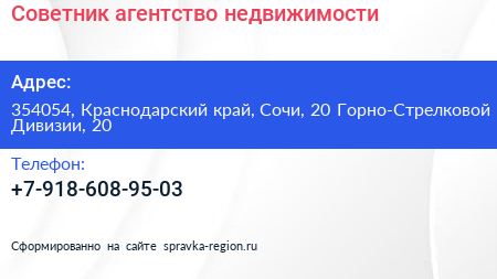 Советник, агентство недвижимости по адресу 354054, Краснодарский край, Сочи, 20 Горно-Стрелковой Дивизии, 20 в дальнейшем Организация, размещена в следующих категориях: