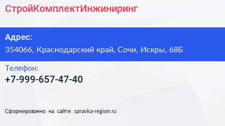 СтройКомплектИнжиниринг по адресу 354066, Краснодарский край, Сочи, Искры, 68Б в дальнейшем Организация, размещена в следующих категориях:
