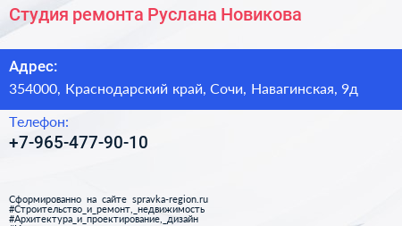 Студия ремонта Руслана Новикова по адресу 354000, Краснодарский край, Сочи, Навагинская, 9д в дальнейшем Организация, размещена в следующих категориях:
