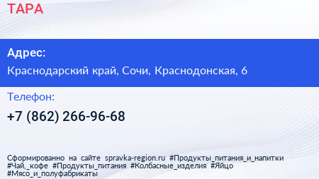 ТАРА по адресу Краснодарский край, Сочи, Краснодонская, 6 в дальнейшем Организация, размещена в следующих категориях: