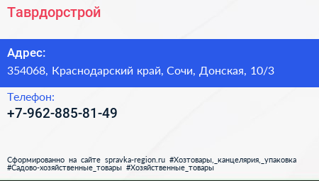 Таврдорстрой по адресу 354068, Краснодарский край, Сочи, Донская, 10/3 в дальнейшем Организация, размещена в следующих категориях: