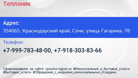 Теплоник по адресу 354065, Краснодарский край, Сочи, улица Гагарина, 78 в дальнейшем Организация, размещена в следующих категориях: