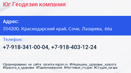 Юг-Геодезия, компания по адресу 354200, Краснодарский край, Сочи, Лазарева, 66а в дальнейшем Организация, размещена в следующих категориях: