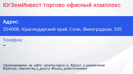 ЮгЗемИнвест, торгово-офисный комплекс по адресу 354008, Краснодарский край, Сочи, Виноградная, 105 в дальнейшем Организация, размещена в следующих категориях: