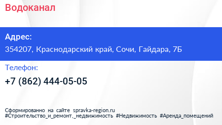 Водоканал по адресу 354207, Краснодарский край, Сочи, Гайдара, 7Б в дальнейшем Организация, размещена в следующих категориях: