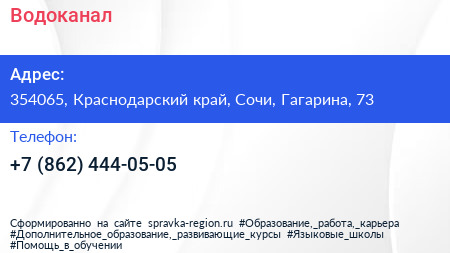 Водоканал по адресу 354065, Краснодарский край, Сочи, Гагарина, 73 в дальнейшем Организация, размещена в следующих категориях: