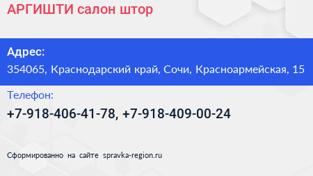 АРГИШТИ, салон штор по адресу 354065, Краснодарский край, Сочи, Красноармейская, 15 в дальнейшем Организация, размещена в следующих категориях: