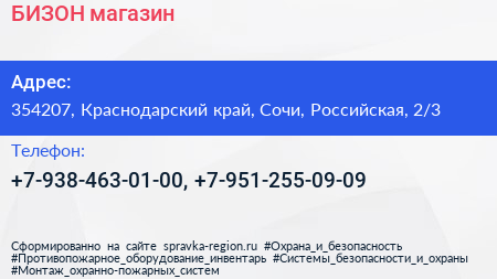 БИЗОН, магазин по адресу 354207, Краснодарский край, Сочи, Российская, 2/3 в дальнейшем Организация, размещена в следующих категориях: